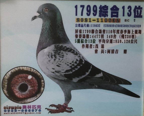 2021-118632 榮獲2021年春季屏東1799聯合鴿會五關綜合13位,全會4,477羽149舍參賽230羽完翔