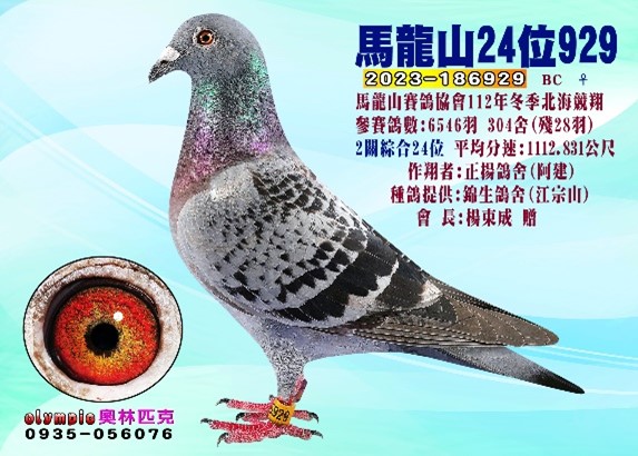 2023-186929 榮獲2023年冬季馬龍山賽鴿協會二關綜合24位,全會6,546羽304舍參賽28羽完翔