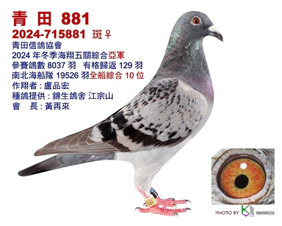 2024-715881 榮獲2024年冬季青田信鴿協會五關綜合亞軍、南北海船隊19,526羽全船綜合10位,全會8,037羽參賽129羽完翔
