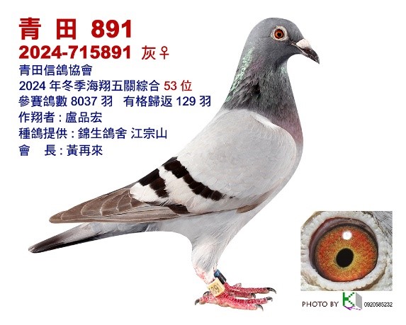 2024-715891 榮獲2024年冬季青田信鴿協會五關綜合53位,全會8,037羽參賽129羽完翔