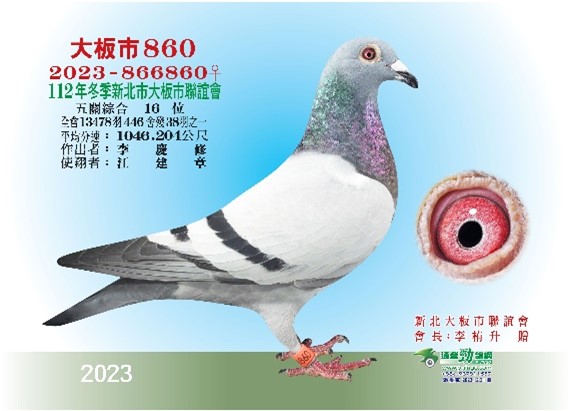 2023-866860 榮獲2023年冬季新北市大板市聯誼會五關綜合16位,全會13,478羽446舍參賽38羽完翔