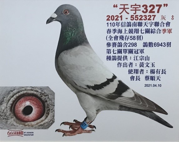 2021-552327 榮獲2021年春季台南天宇聯合會七關綜合季軍,全會6,943羽298舍參賽58羽完翔